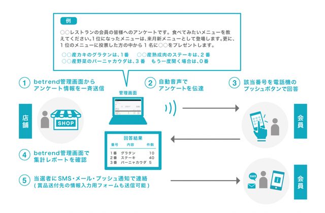 スマートCRMプラットフォーム『betrend』を提供するビートレンド株式会社(本社:東京都港区、代表取締役社長:井上英昭、以下 ビートレンド)は、2月18日(水)、『betrend カスタムIVR』をリリースいたしました。従来のメール・SMS・プッシュ通知に加え、通話を活用した情報の受発信に対応することで、誰もが簡単に利用できるスマートCRMを実現します。 『betrend カスタムIVR』の概要 (1) メール・SMS・プッシュ通知...