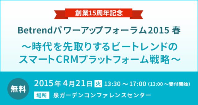 創業15周年記念 Betrend パワーアップフォーラム 2015 春 ~時代を先取りするビートレンドのスマートCRMプラットフォーム戦略~ ビートレンド株式会社は「顧客価値の創造」を経営理念に、今年3月に創業15周年を迎えました。これもひとえに、お客様・お取り引き様の日頃のご愛顧の賜物であると感謝申し上げます。この機会に、記念セミナーを開催し、先進的なbetrendユーザ様のCRM戦略やビートレンドの「スマートCRM」の更なるサービス...